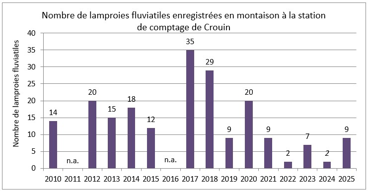 Ces chiffres ne sont pas exhaustifs dans la mesure ou de fortes crues ont pu rendre le barrage de Crouin franchissable par les clapets et le seuil donc sans nécessairement passer par la passe à poissons.
