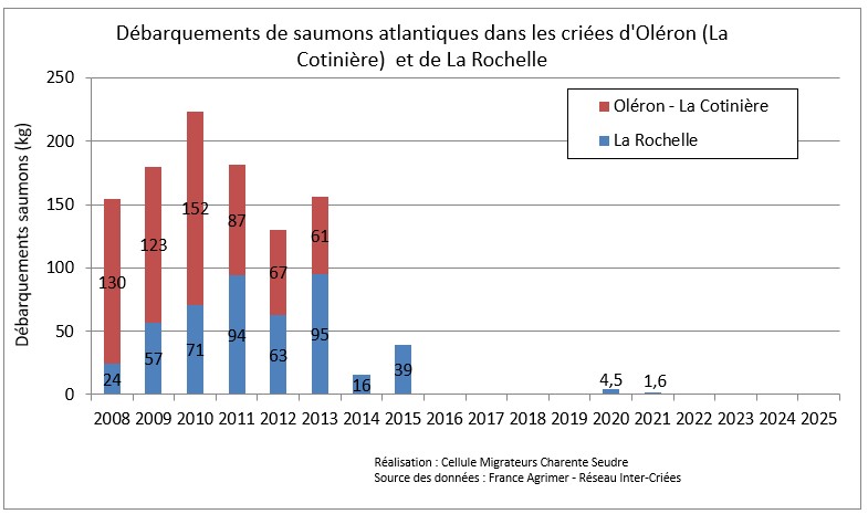 La situation du Saumon sur le bassin versant de la Charente semble très critique. Après la disparition du Saumon sur la Boutonne, les remontées de Saumon sur l’axe Charente semblent de plus en plus sporadiques. Dans les années 1960-70, plusieurs prises annuelles de Saumons signalaient encore des remontées. Depuis, les prises et témoignages de remontées sont beaucoup plus rares et traduisent d’une faible abondance du stock (PLAGEPOMI 2008-2012).