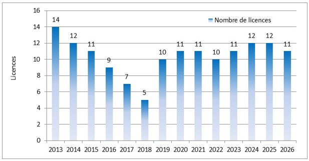 On observe des années sans pêcheurs déclarants et sans jours de pêche. Précisons que cela indique uniquement qu’il n’y a pas eu de déclarations mais pas qu’il n’y a pas eu de captures non déclarées.