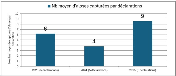 | Effort de pêche (Nombre moyen de captures d’aloses par sorties) | 4,72 | 5,82 |