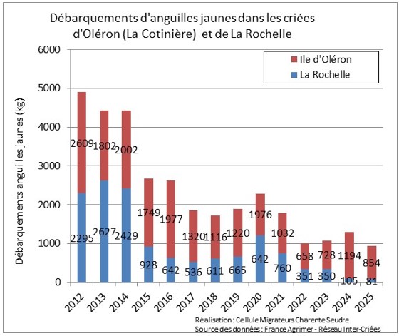 Il faut préciser que les débarquements à la criée de Royan concernent surtout les captures effectuées sur la Gironde ou au large de cet estuaire. Les anguilles débarquées sont donc probablement des individus qui étaient destinées au bassin versant Garonne-Dordogne plutôt que Charente.