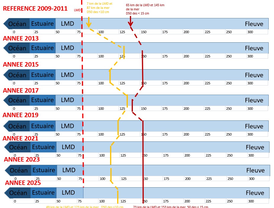 – État 2025 non défini : Pas de seuils établis actuellement. – Tendance 2025 stable : Les résultats de 2025 sont similaires à ceux observés depuis 2013, avec une D50* de 123 km (à la mer) pour les moins de 10 cm et de 153 kms pour les moins de 15 cm.
