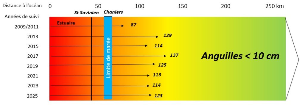 Suivre la répartition des anguilles de moins de 10 cm le long de l’axe Charente afin d’identifier les fluctuations de la colonisation du bassin selon le principe de migration densité-dépendant : plus la densité d’anguilles recrutées en aval du bassin augmente, plus le front de colonisation se déplace vers l’amont. Le suivi dans le temps de cette limite amont de répartition des « jeunes » stades d’anguilles semble constituer un bon indicateur de la tendance du recrutement fluvial en relation avec la mise en place de solutions de gestion adaptées pour l’espèce.
