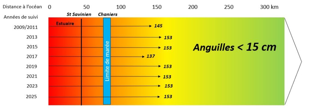 La distance de disparition des anguilles <10 cm et <15 cm à la dernière station prospectée pour laquelle au moins 1 anguille de ces deux tailles respectives a été retrouvée.