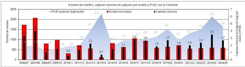 - Tendance 2025 stable : la moyenne des captures par unité d’effort en 2024/2025 (4,6 kg/marée) et similaire à la moyenne des 5 dernières années (4,2 kg/marée), et plus basse qu’en 2023/2024 (6 kg/marée).