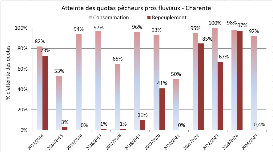 Le graphique ci-dessous représente le pourcentage atteint des sous-quotas pour les pêcheurs fluviaux « Charente ».