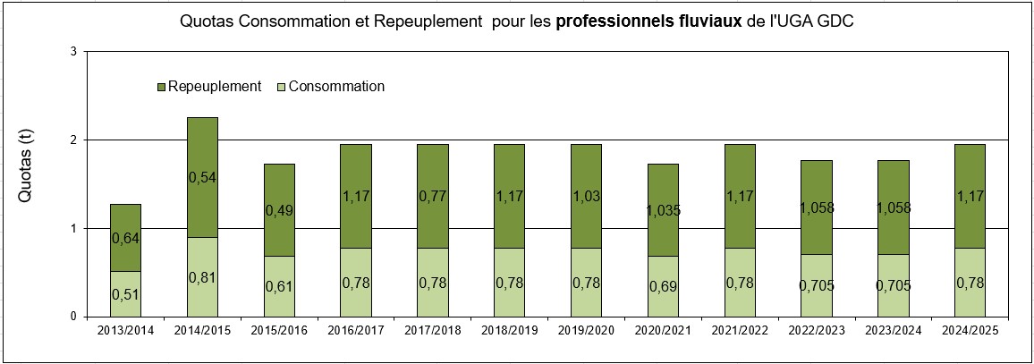 Ci-dessous les quotas Consommation et Repeuplement sur les UGA GDC (Garonne-Dordogne-Charente-Seudre-Leyre).