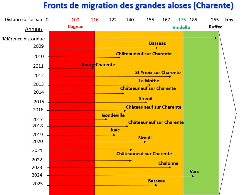 Le front de migration est la zone la plus en amont où a été observé une Grande alose sur l’axe Charente. Le suivi de ce front au cours du temps permet de voir l’évolution des conditions de circulation de cette espèce.
