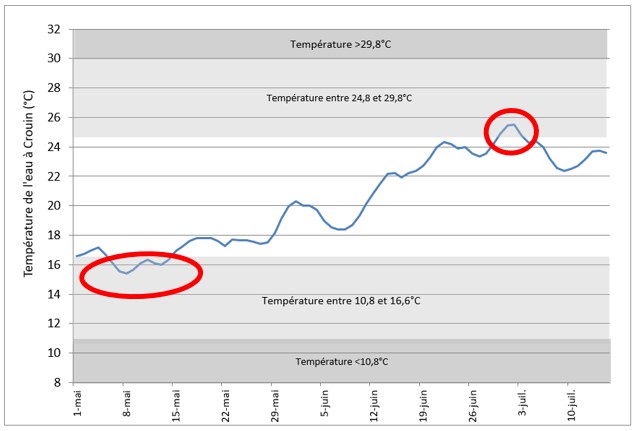 • État 2025 Bon : car la température de l’eau pour les œufs et les larves était optimale sur quasiment toute la période considérée (83% du nombre de jours du 1er mai au 15 juillet).